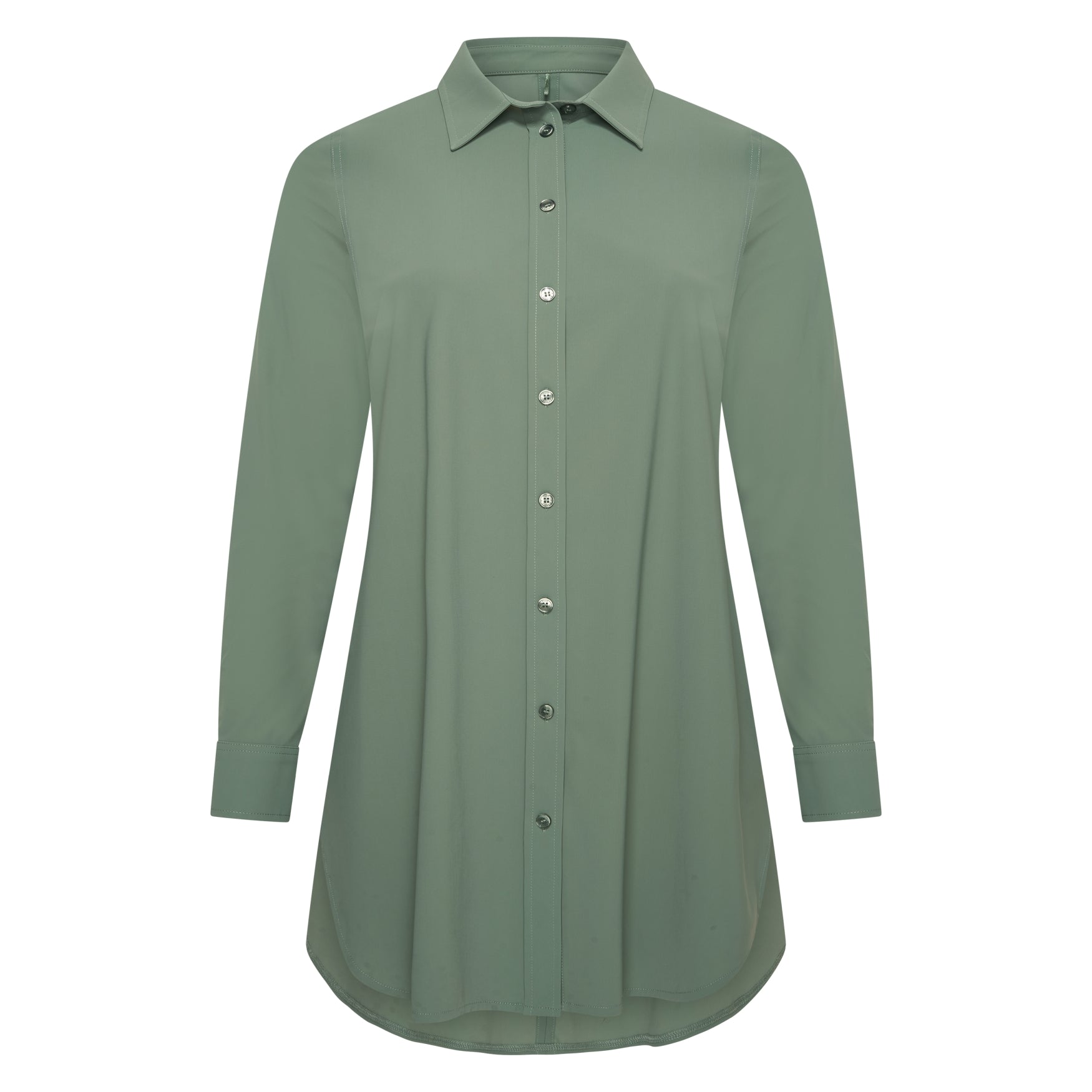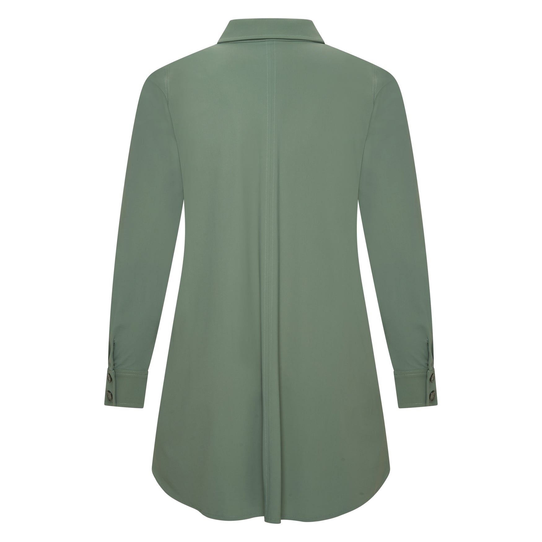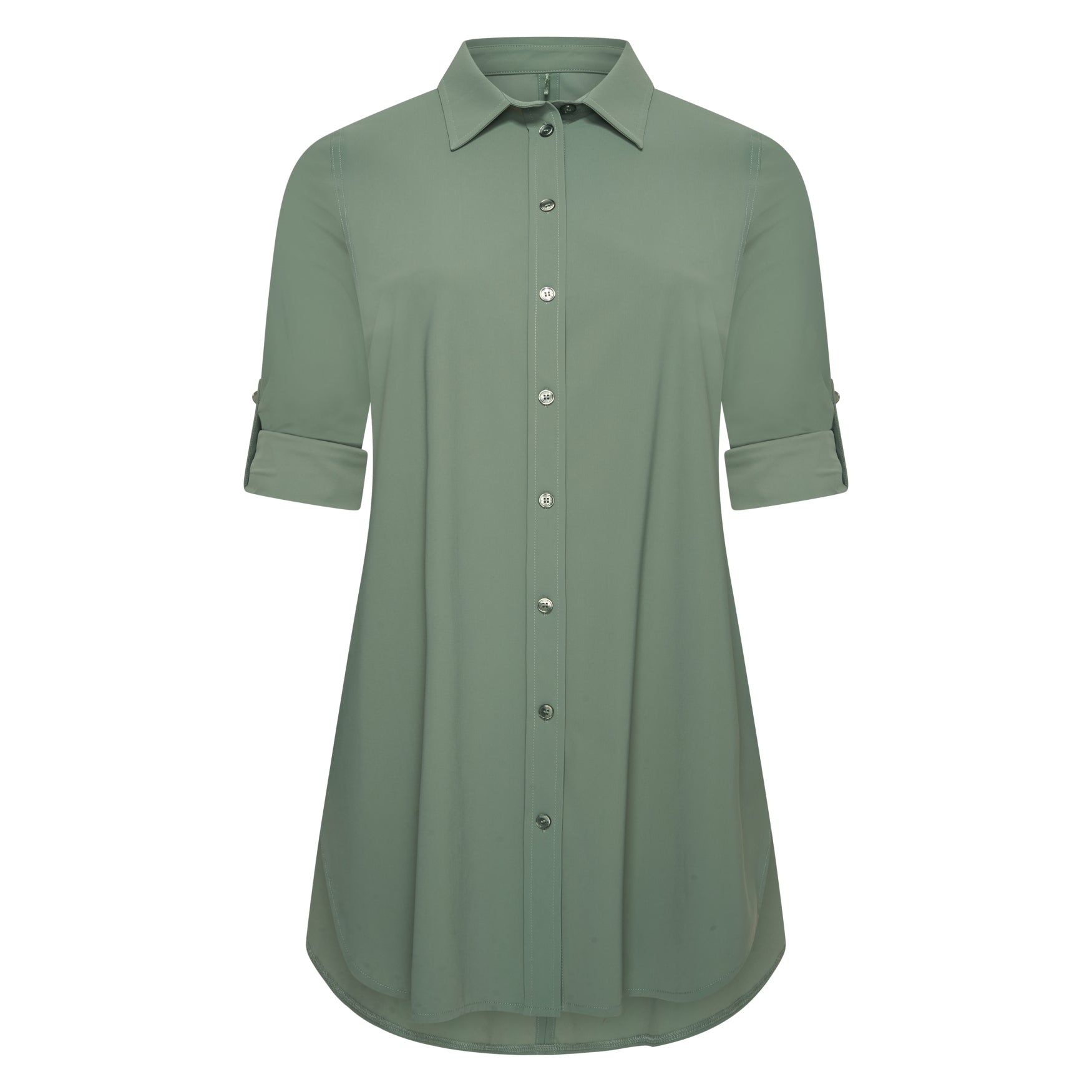 Sportieve blouse met zichtbare knoopsluiting en ronde bottom met split.