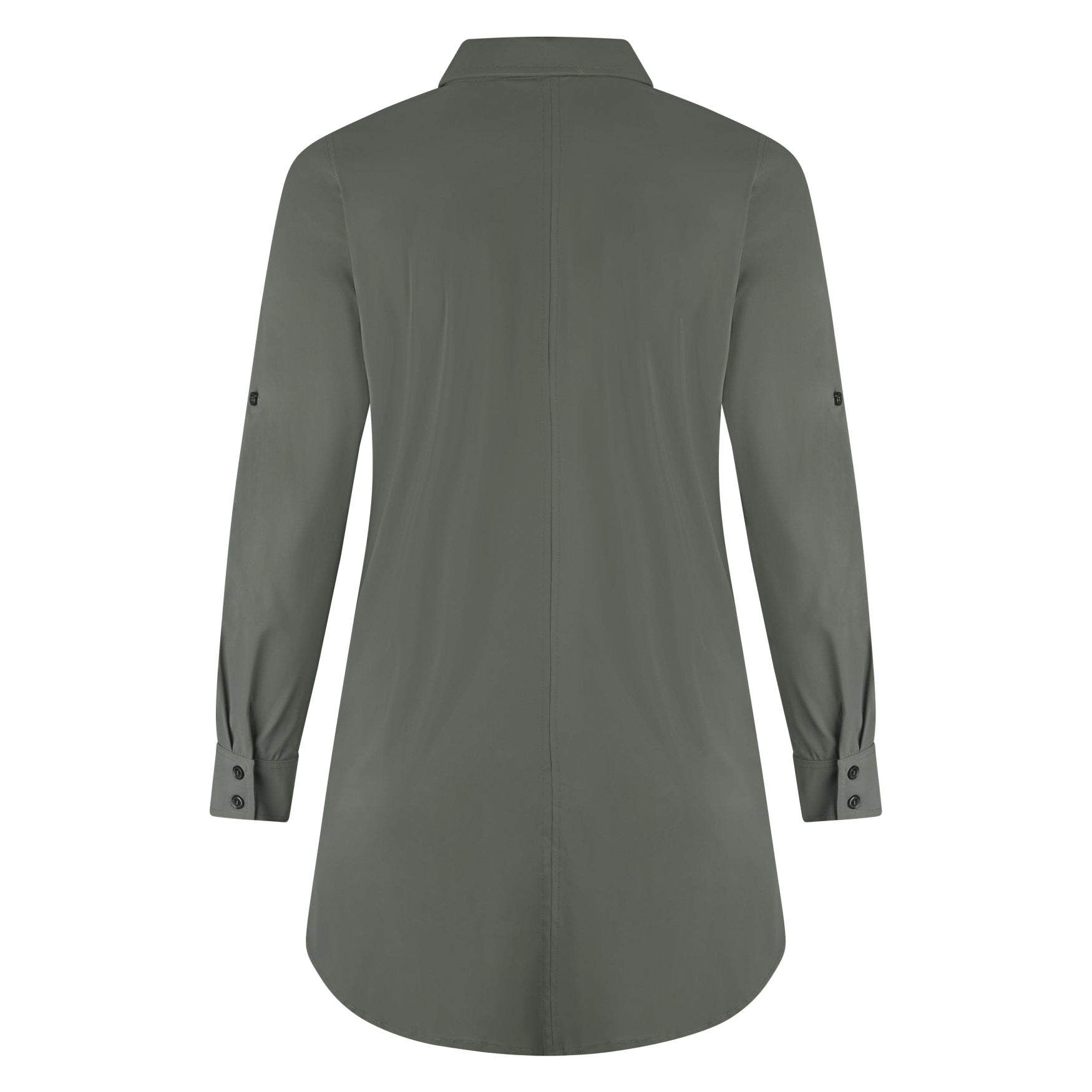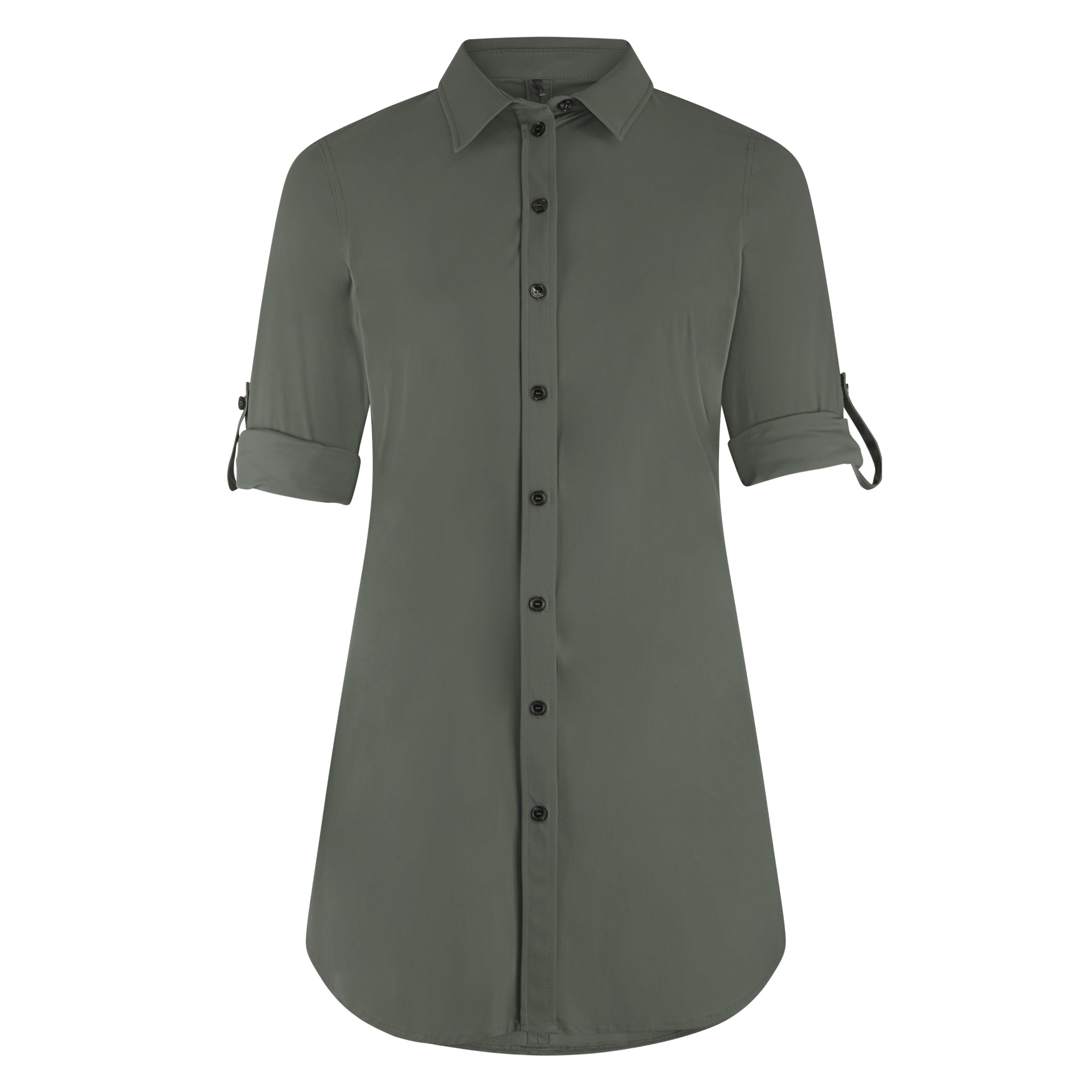 Sportieve blouse met zichtbare knoopsluiting en ronde bottom met split.