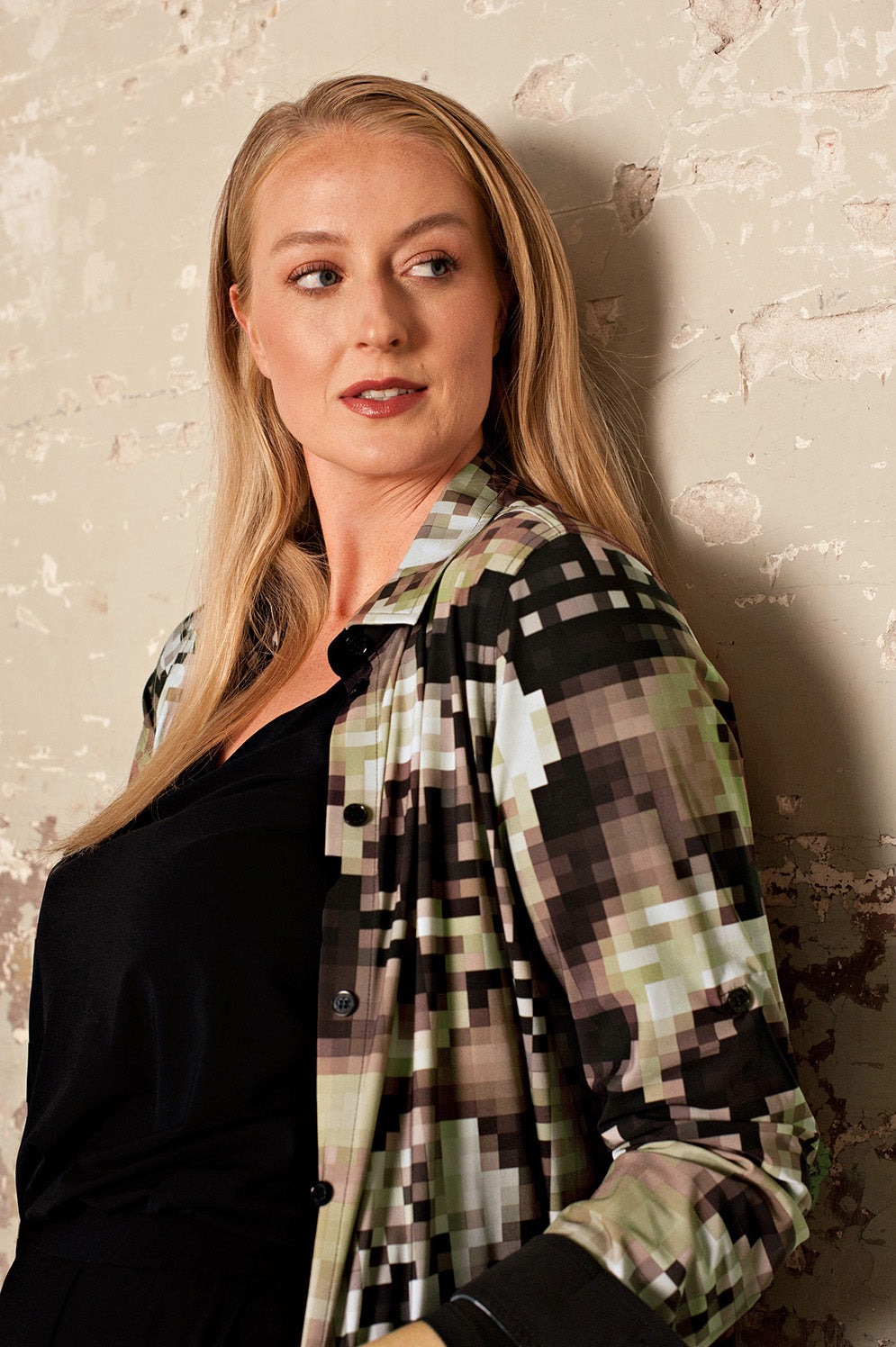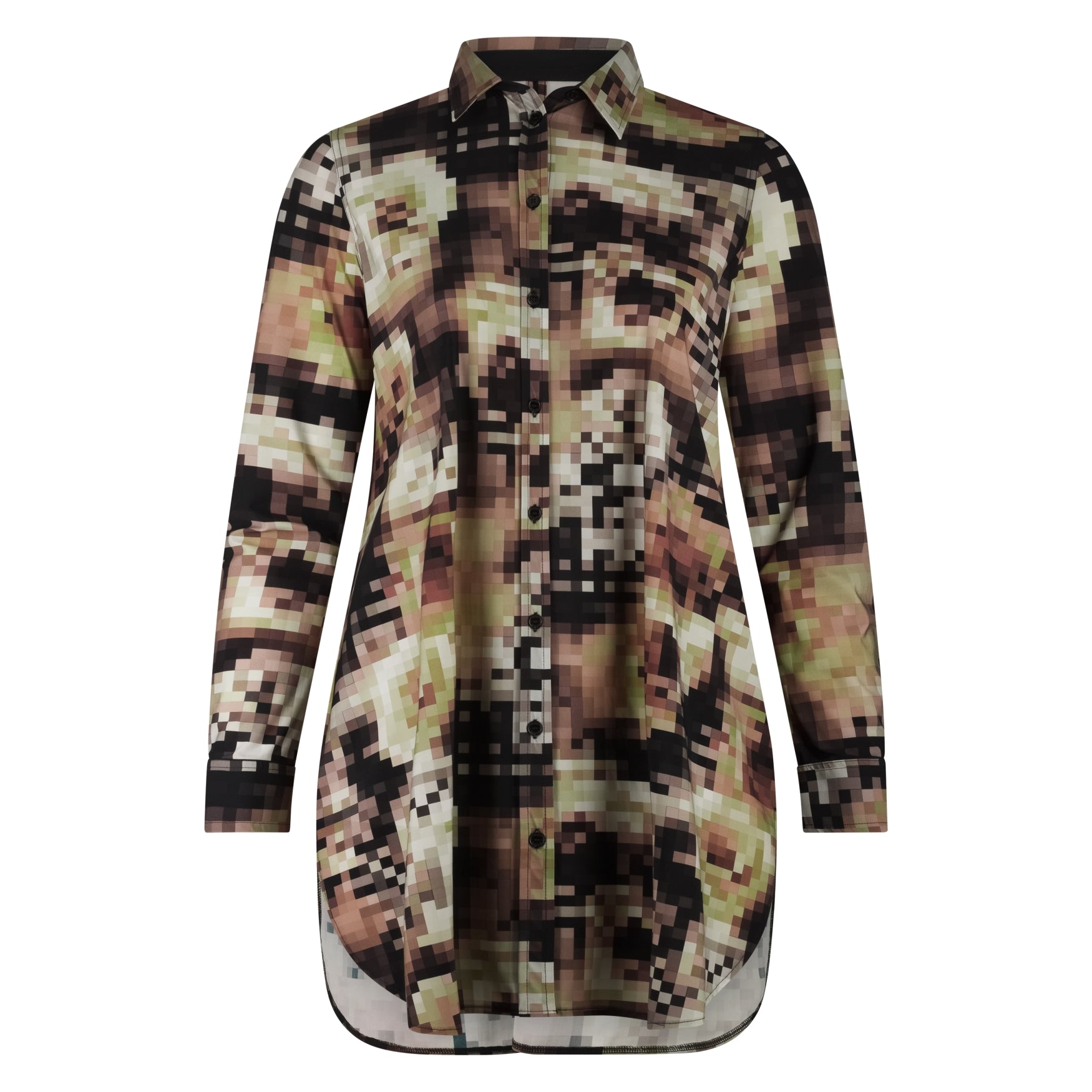 Sportieve blouse met zichtbare knoopsluiting en ronde bottom met split.