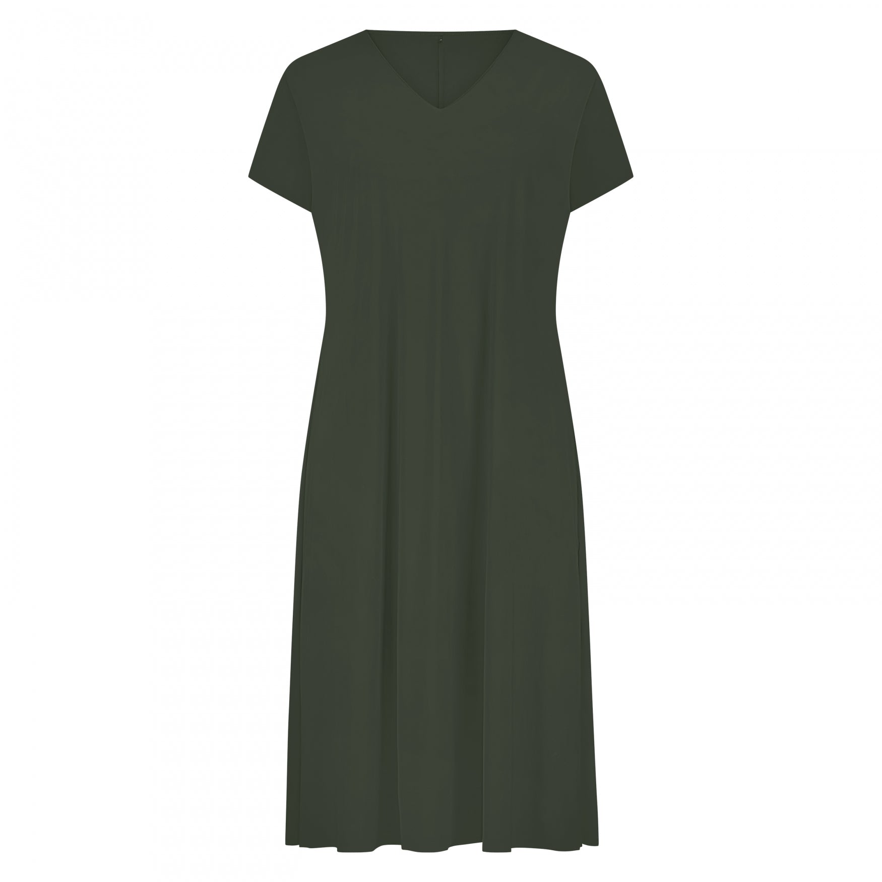 Lange, soepelvallende A-lijn jurk met V-hals en aangeknipte mouw met splitje.