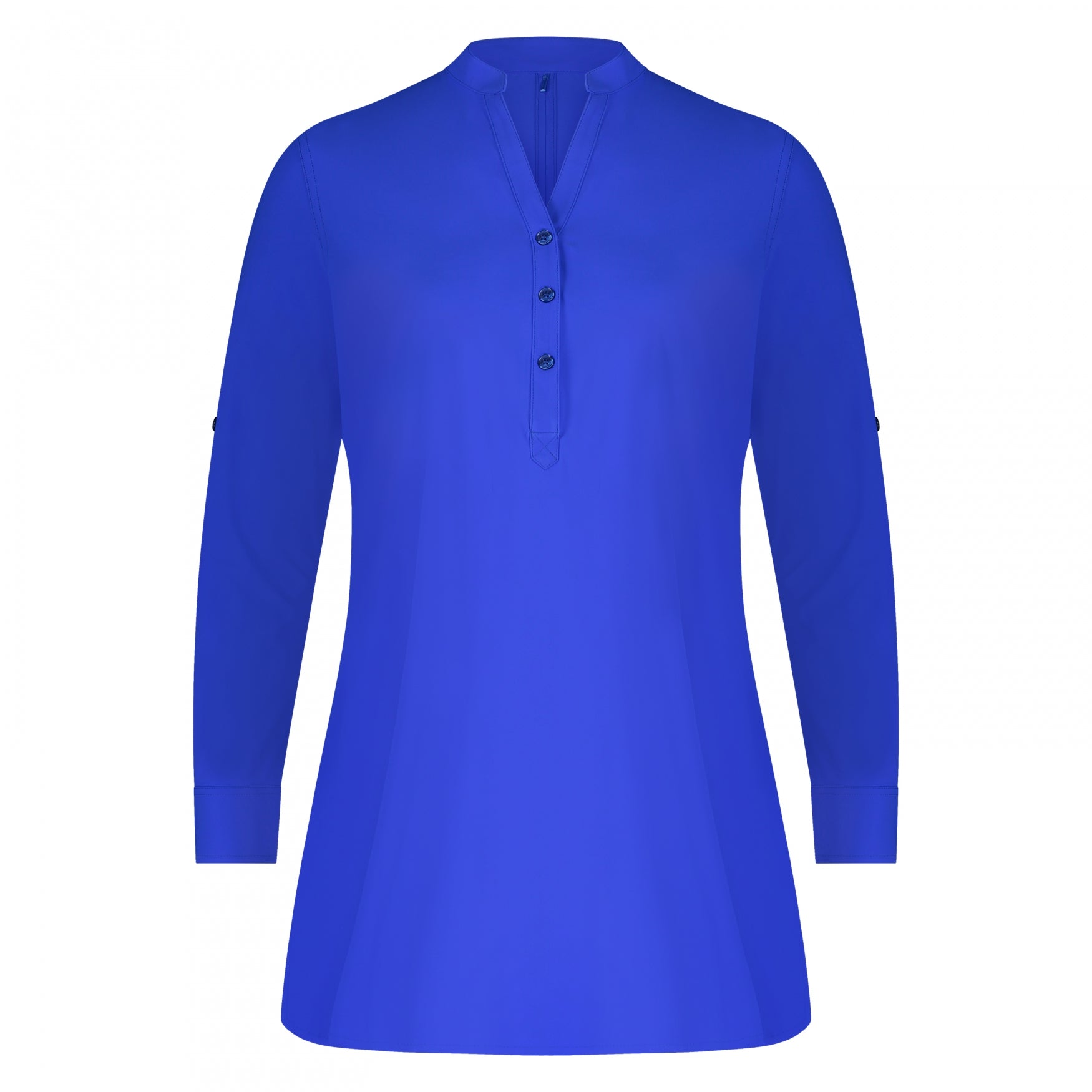 Top met lange, oprol mouw en mao kraag met knoopjes op de sluiting. Manchet met 2 knopen. Ronde bottom. Engelse naad op rugpand. Lengte 85 cm.