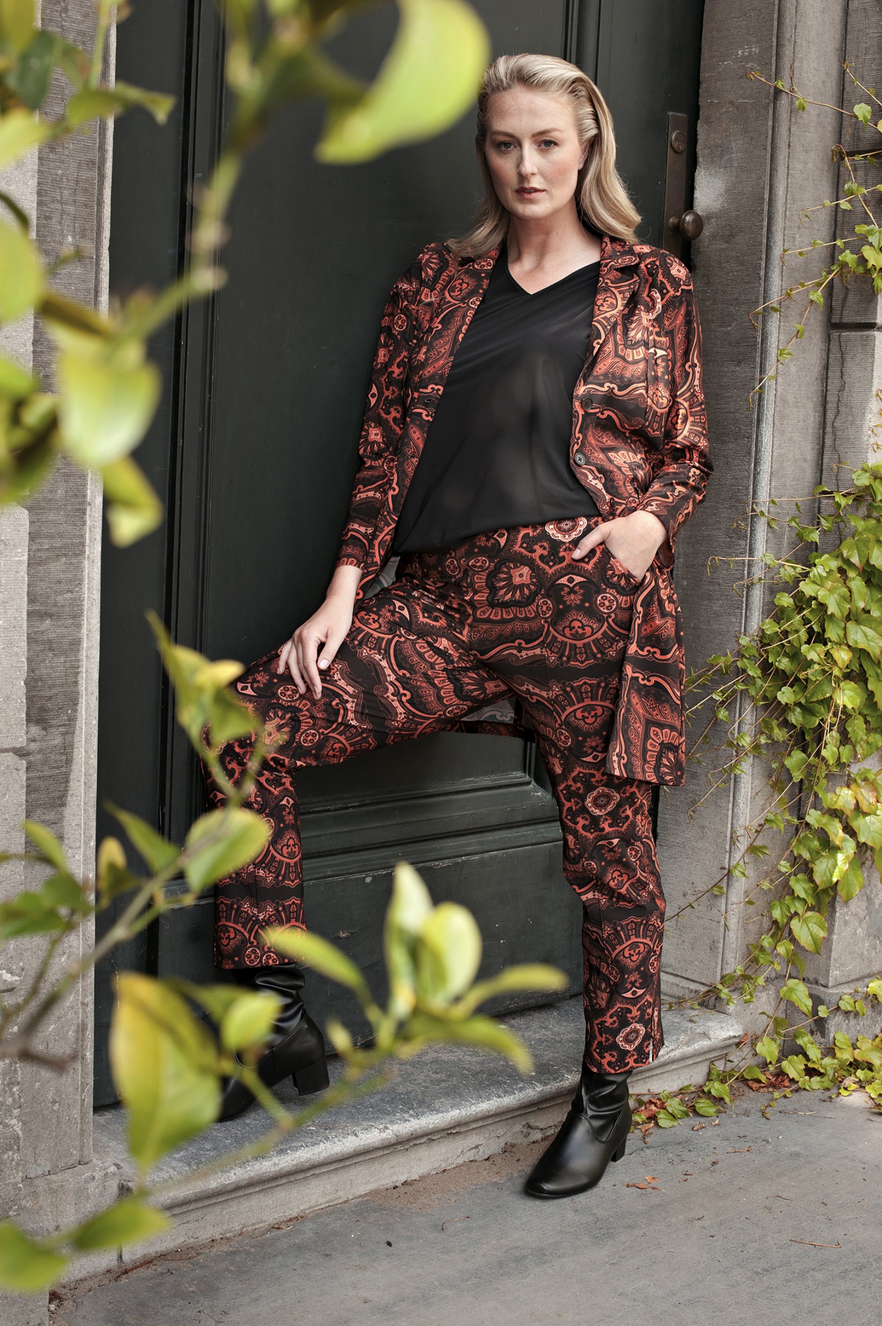 Rechte city broek met 2 steekzakken voor en 2 fake strookzakken achter. Ingestikte naad op been voor. Split onderaan op pijp.