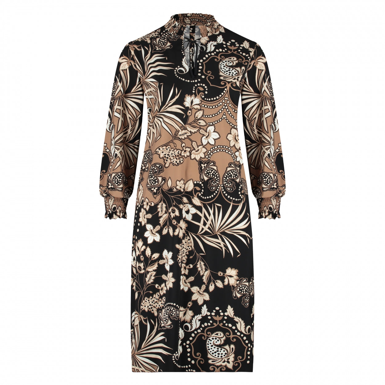 Lange, uitlopende jurk met smock kraag en manchetten. Kraag met V hals en strikje.
