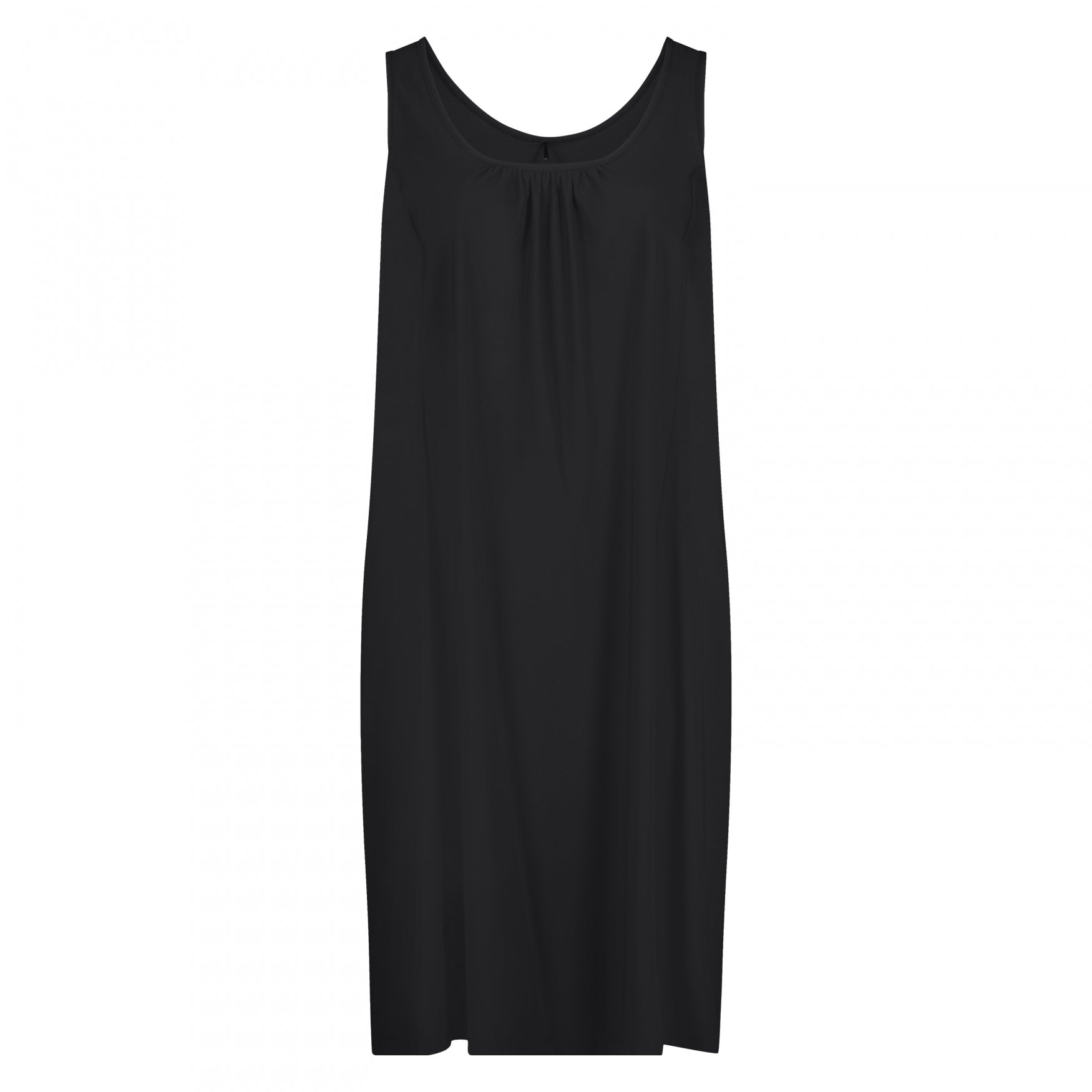 Mouwloze, lange jurk met plooien langs halslijn voor. Lengte 133 cm (mt 46)