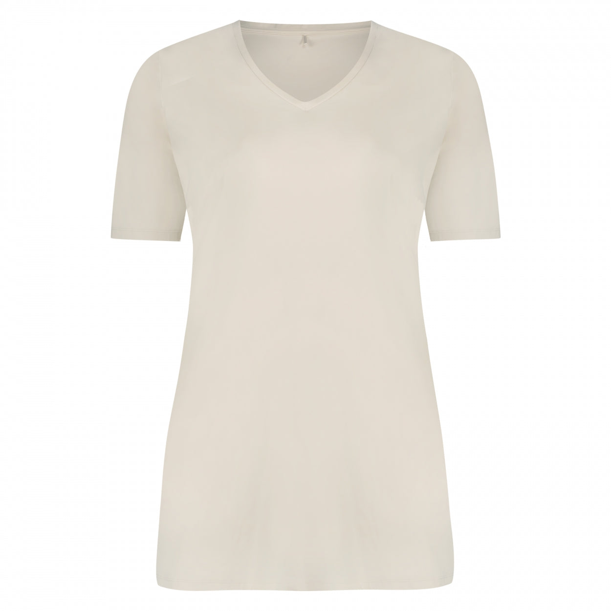 T-shirt met V-hals en slanke mouw tot aan de elleboog.