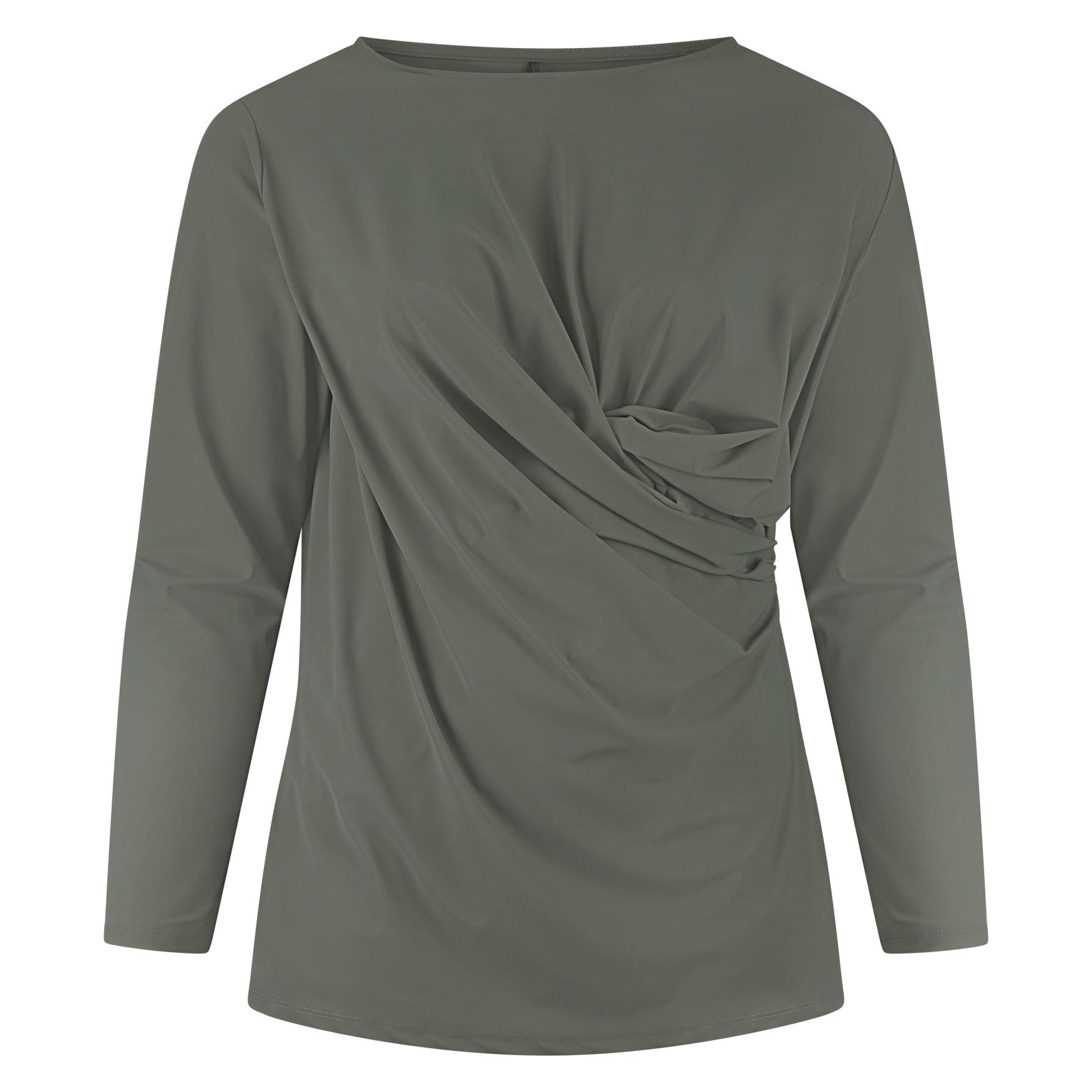 T-shirt lange mouw met ronde hals. bovendeel mouw is ruimer door de ingewerkte plooi.