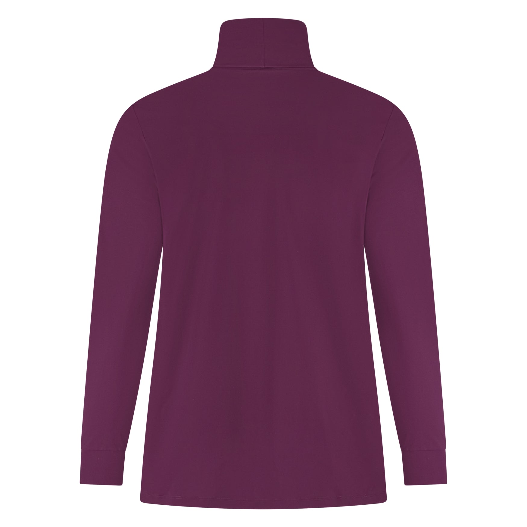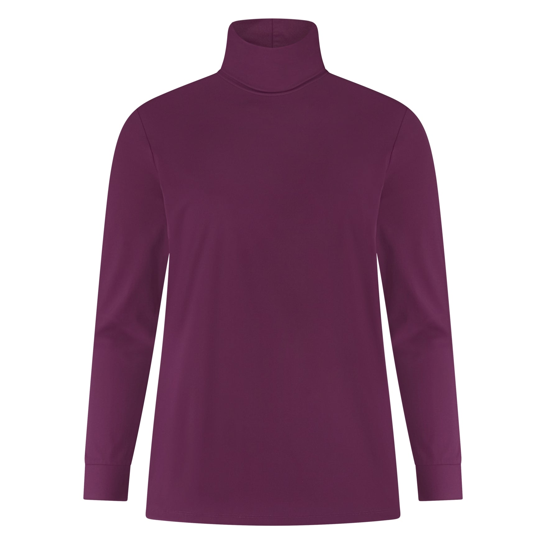 Top met dubbele hoge kol en met lange mouw en hoge manchet. 2 splitten in zijnaad. Lengte 78 cm (46)