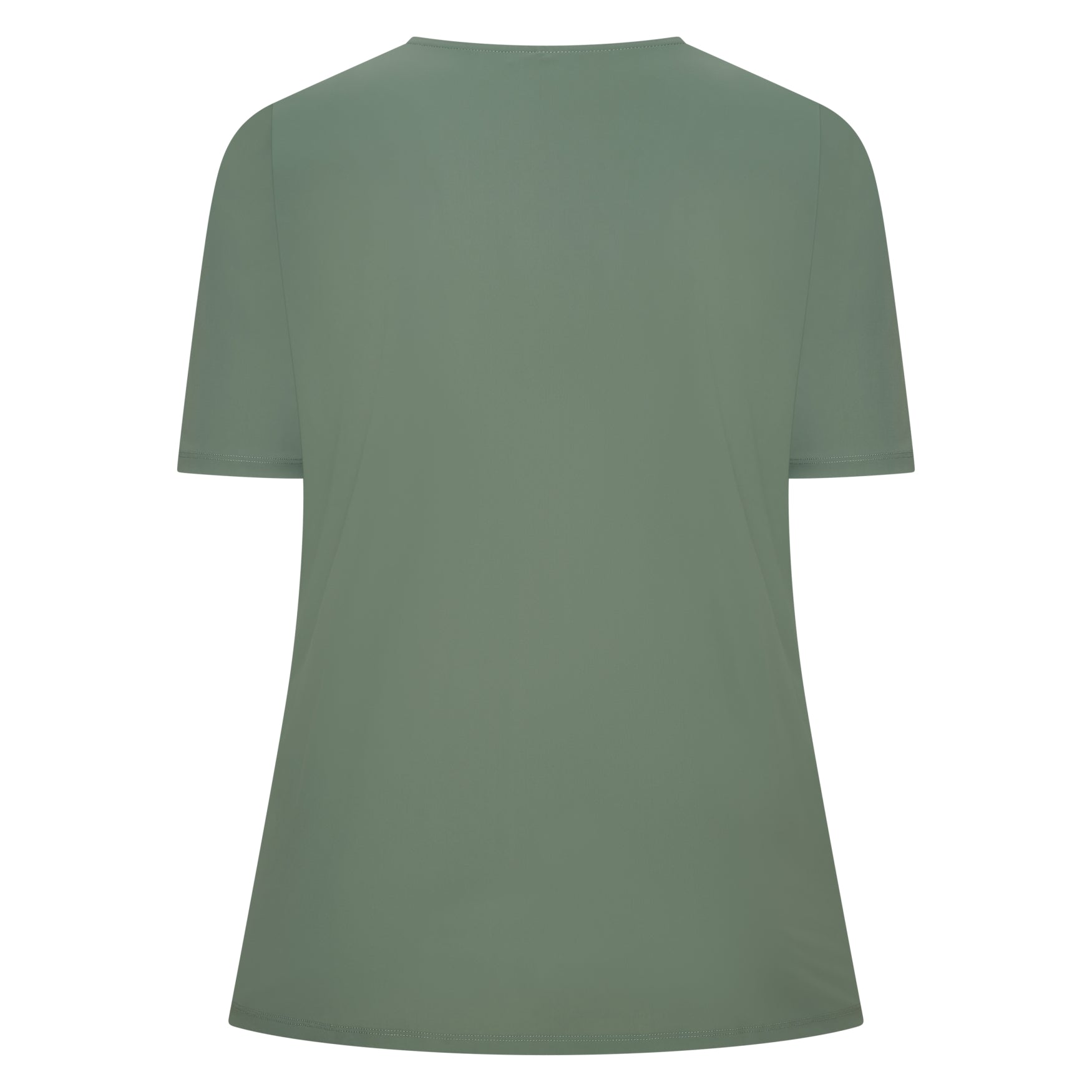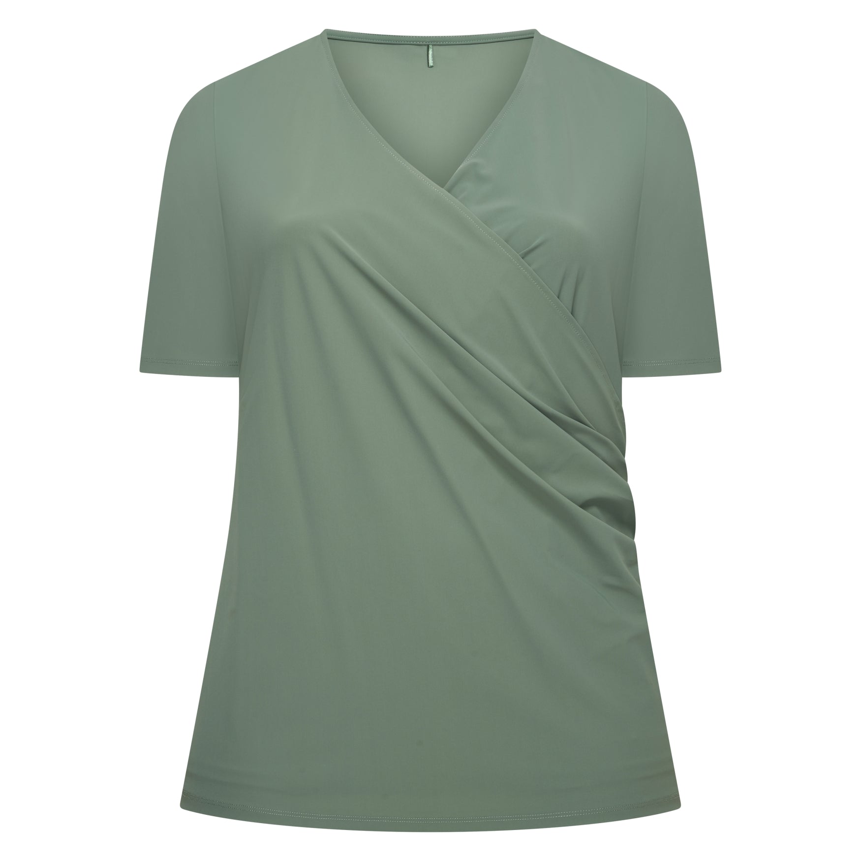 Korte mouw top in lengte van 85 cm. Overslag met plooien.