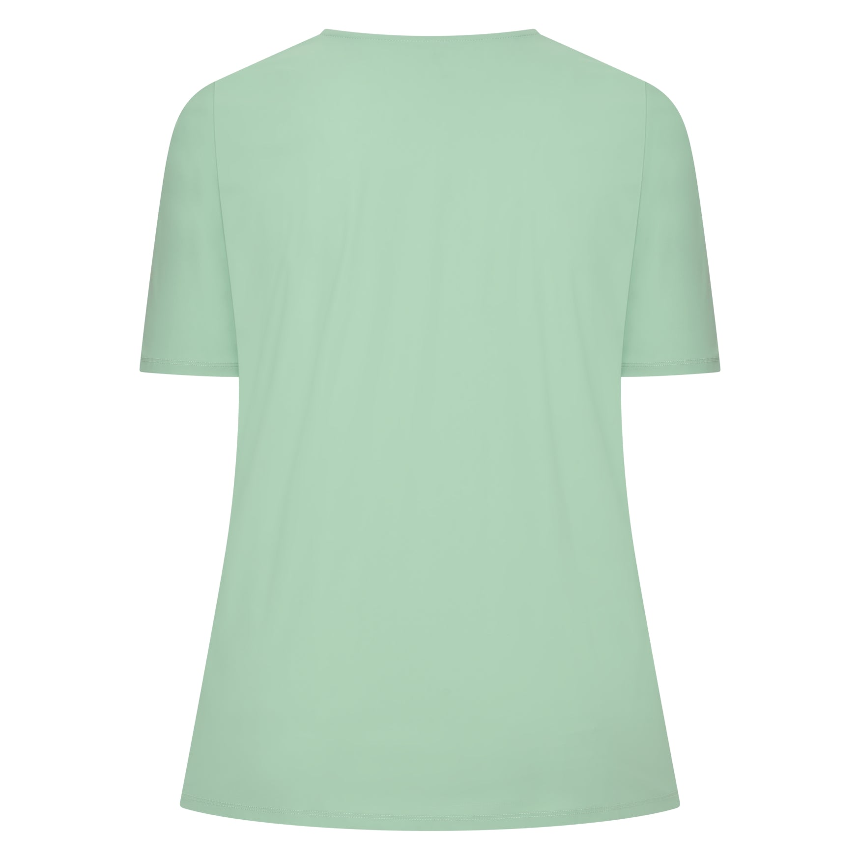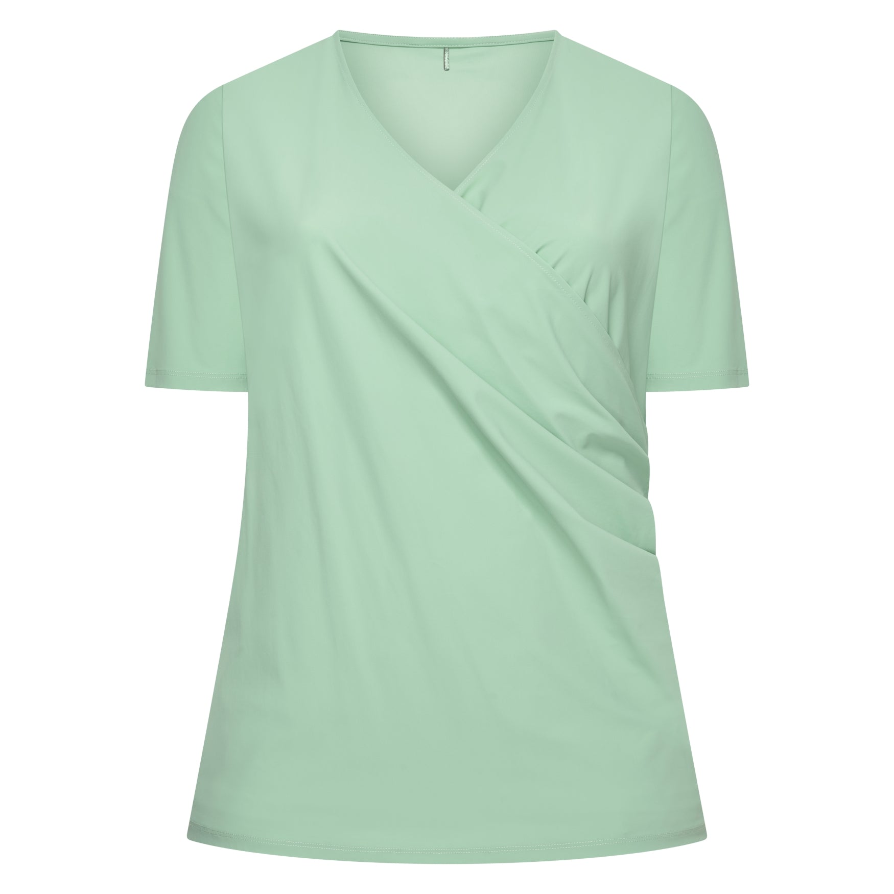 Korte mouw top in lengte van 85 cm. Overslag met plooien.